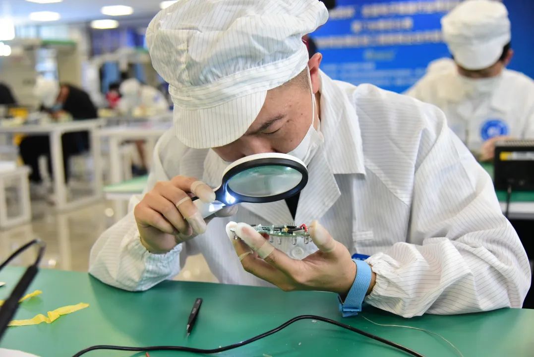 参赛选手们分为4组进行比赛。现场,选手们手拿电烙铁、镊子等工具,聚精会神地将电子元件焊接到电路板上,在1个小时的比赛时间里完成组装的全过程,实现电子产品的功能。