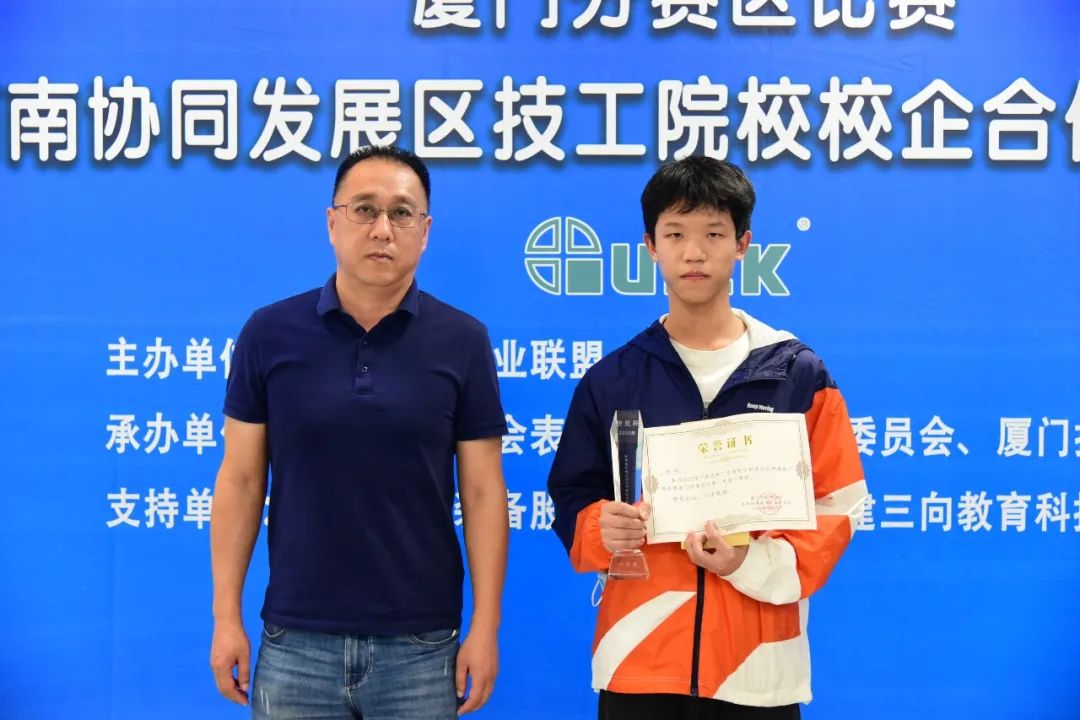 颁奖现场,学院副院长赵广平、教务处副处长刘晋英、厦门市技师协会秘书长陈瑞娟、快克智能装备股份有限公司产品经理卞聪、福建三向教育科技有限公司总经理廖盛禄以及裁判团队,分别为一等奖、二等奖、三等奖、最佳工艺奖、最佳规范奖、优胜奖获奖选手颁奖。 值得一提的是,我院电子光电工程系学生邹邦在此次比赛中脱颖而出,以44分钟全场最短的完赛时间、高质量的焊点表现等突出成绩,一举夺得此次比赛的一等奖和最佳工艺奖,成为此次比赛的最大赢家。 我院参赛选手郑富友、陈敏、林颜章也在比赛中获得优胜奖。