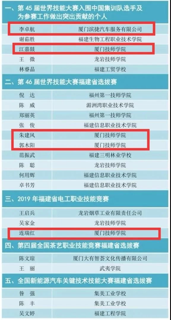 江嘉燚,车辆工程系汽修实习指导教师,福建省优秀指导教师,第45届世界技能大赛“汽车技术项目”,福建省赛第一名,入围国家集训队选手的教练;2019年9月获福建省人力资源和社会保障厅、共青团福建省委联合通报表扬,被授予“福建省青年岗位能手”;2020年1月获福建省人力资源和社会保障厅通报表扬。 郭木阳,信息技术与文化创意系教师、第46届世赛技能大赛福建“信息网络布线”集训基地教练组长,多次指导学生参加省市职业技能竞赛获得第一名,荣获福建省技术能手、福建省优秀指导教师等称号。