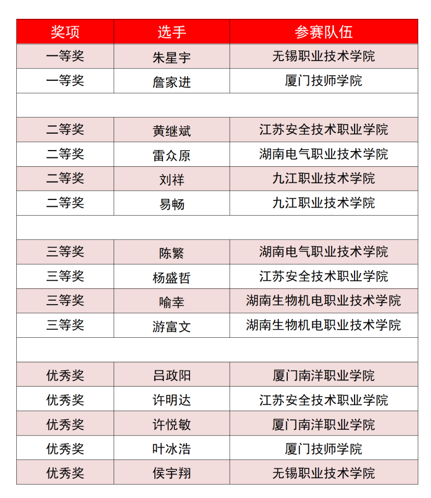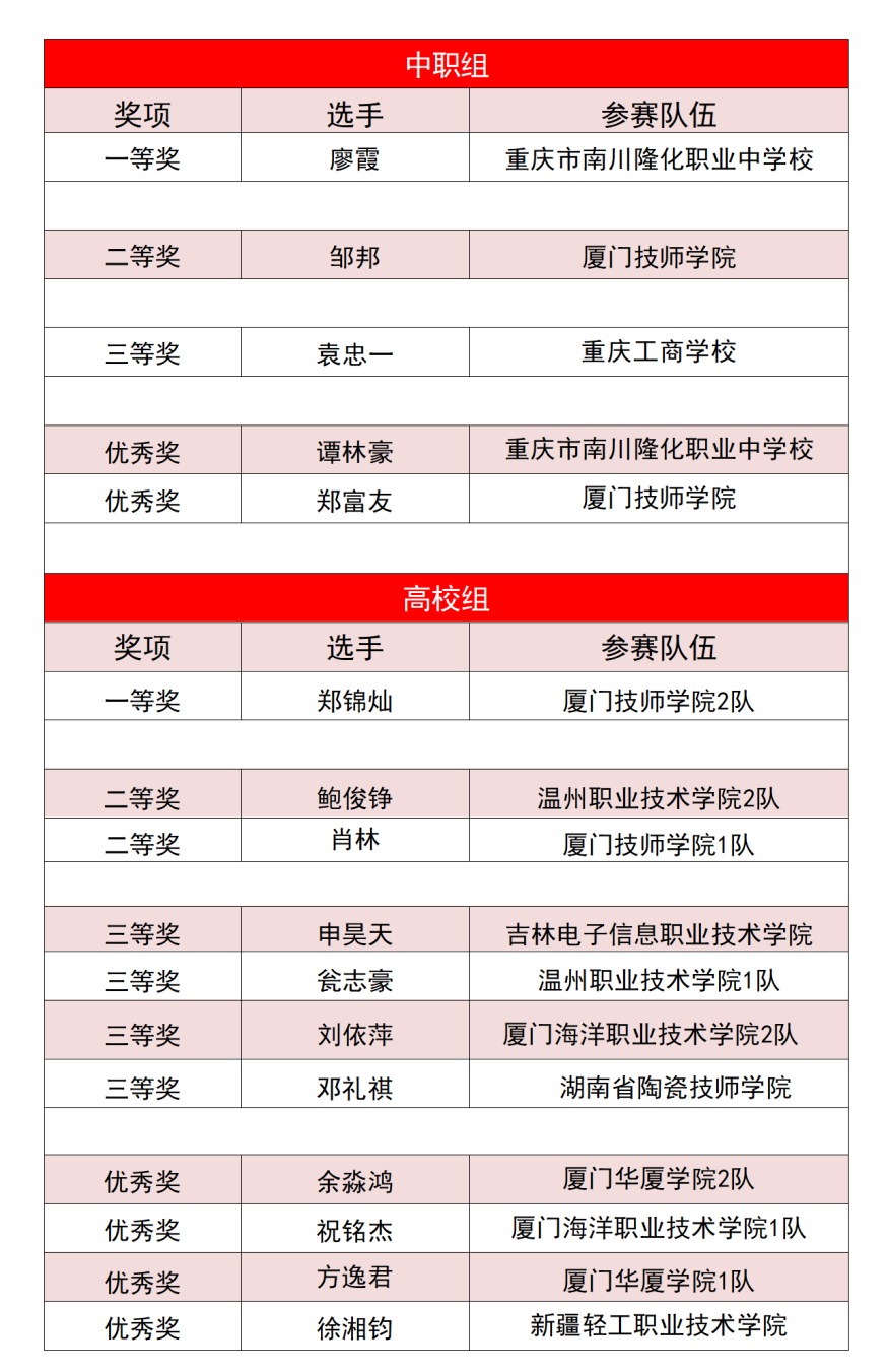 本次大赛评选出3个赛项的一、二、三等奖及优秀奖。其中,中职组和高校组获得一、二等奖的参赛队同时分获“最佳组织奖”和“优秀组织奖”,指导老师获“优秀指导老师奖”。此外,另有4家单位荣获“突出贡献奖”。