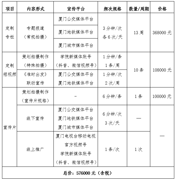 本项目为学院宣传工作重点项目,通过厦门公交媒体平台、厦门地铁媒体平台、厦门城市媒体平台、车厢内平面媒体平台、新媒体网络平台等在内的户外融媒体矩阵,发布学院招生信息和MG游戏网站、宣传视频等,通过定制专栏、定制系列短视频、定制宣传片等多种形式,线上线下多种渠道扩大学院的地区影响力,是学院新媒体工作的有力保障。为确保宣传质量,学院选取“厦门文广移动传媒有限公司”为本次采购的单一来源供货商。