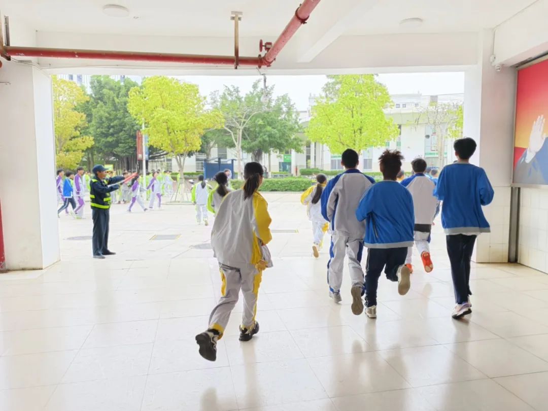 听到疏散警报信号后 大家从前后门有序疏散 并根据教室、实训室、宿舍等不同位置 按照不同楼层 就近从疏散楼梯向下疏散