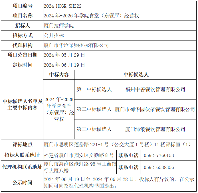 项目编号为2024-HCGK-SH222的2024年-2026年学院食堂(东餐厅)经营权招标项目,于2024年06月19日进行开标、评标,现将中标候选人公示如下: