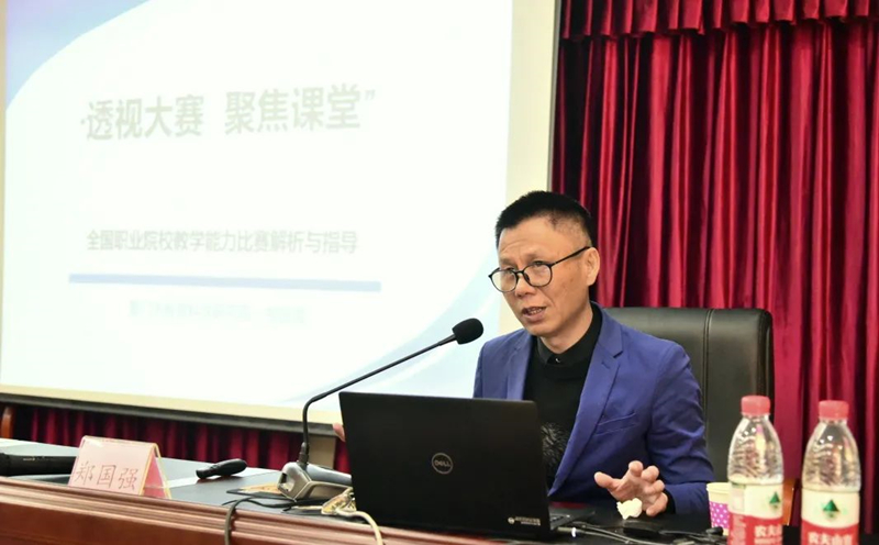结合指导比赛和担任评委的经验,郑国强现场以《“透视大赛 聚焦课堂”全国职业院校教学能力比赛解析与指导》为题,着重从教学实施报告、参赛教案、参赛作品视频、教学实施报告解说、无学生教学展示、答辩等方面进行讲解。郑国强的讲解结合以往参赛作品,以案例教学的方式解剖教学设计的思路方法,深入剖析了参赛注意事项,并与现场教师互动交流,为参会教师传授了经验,提供了素材,指明了方向,并提出了宝贵的建议,让大家深受启发。另外,郑国强还强调,参赛教师要不断探索和实践,反复打磨和提炼,提升教学反思的深度和广度,把专业特色、课程思政、信息化教学等“加分项”有机融入到教学能力比赛中。