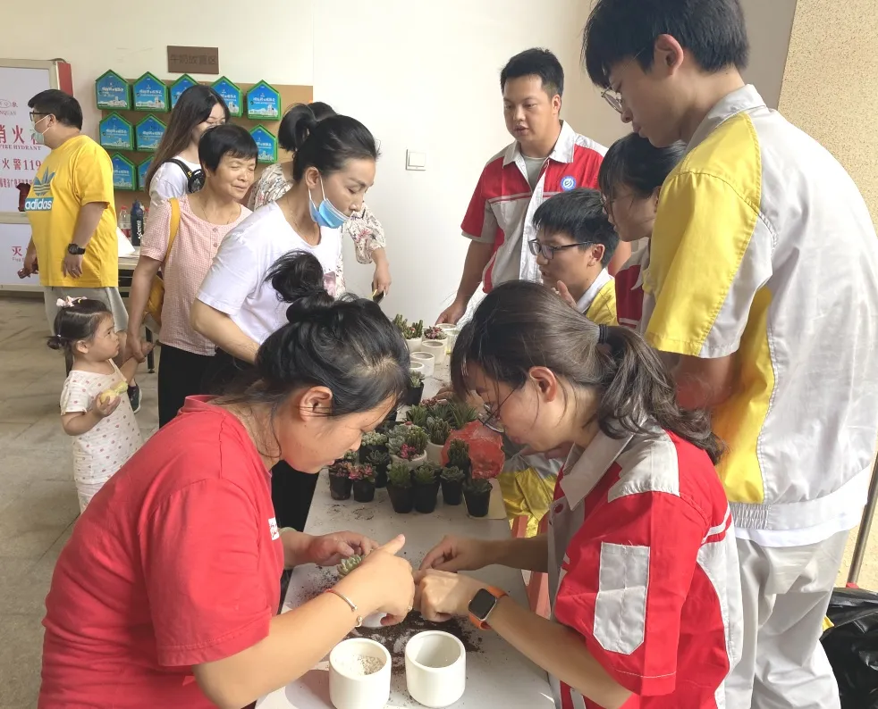 在组合盆栽培训中,居民们排队取号着,建筑工程系园林工程技术专业的师生们现场给每一位居民手把手教学,还向居民讲解了盆器选择、组盆技巧、日常养护等实践技法。居民在老师和学生的指导下,创作出一件件构思新颖、造型别致的组合盆栽作品,感受技能给生活带来的美好与快乐。