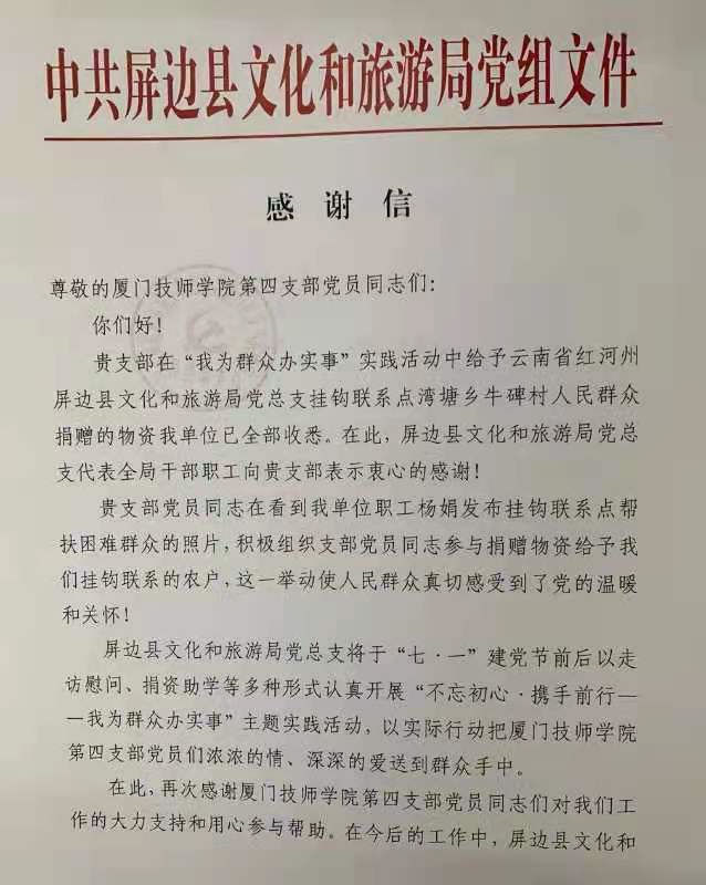 2021年3月,一份90公斤重的爱心包裹从MG游戏官网发出,2个月后,一份写满感谢的信件从云南省红河哈尼族彝族自治州屏边苗族自治县来到MG游戏官网。这是我院第四党支部积极响应云南省红河州屏边县“我为群众办实事”帮扶困难群众的号召,为云南省红河州哈尼族彝族自治州屏边苗族自治县文化和旅游局党总支挂钩联系点湾塘乡牛碑村人民群众捐献爱心衣物。