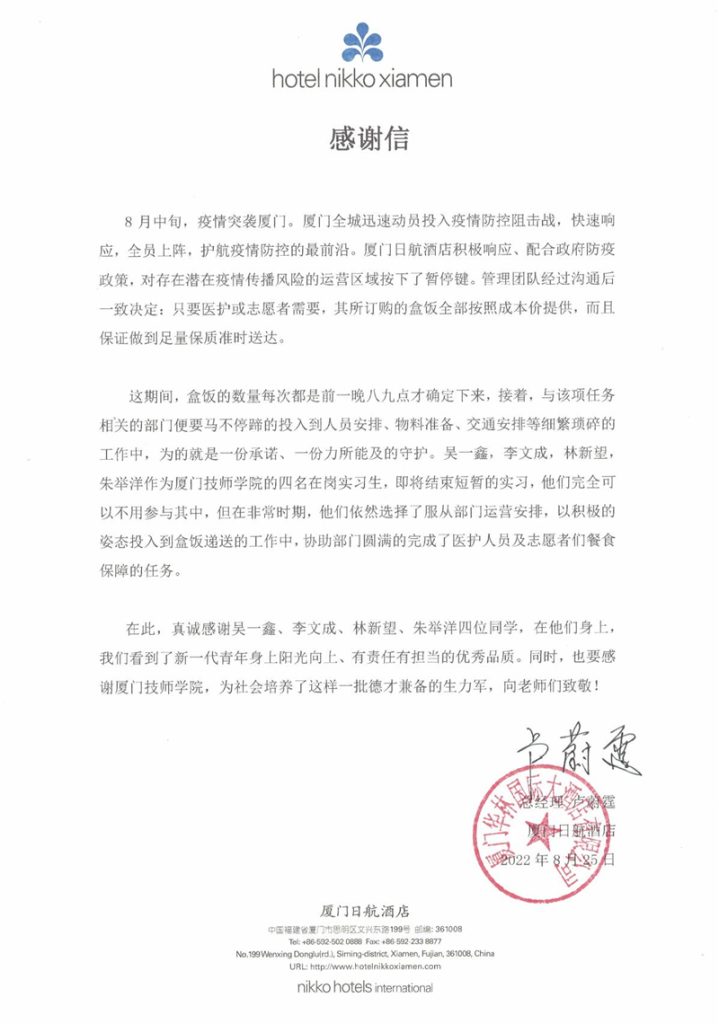 近日,学院收到来自厦门日航酒店(厦门华林国际大酒店有限公司)的一封感谢信。信中对文化基础部21烹饪五(1)班吴一鑫、李文成、林新望、朱举洋等4名同学在暑假实习期间主动积极投入疫情防控保障工作的责任和担当给予了高度肯定,并感谢学院为社会培养了这样一批德才兼备的生力军。(文化基础部郑红燕供稿)