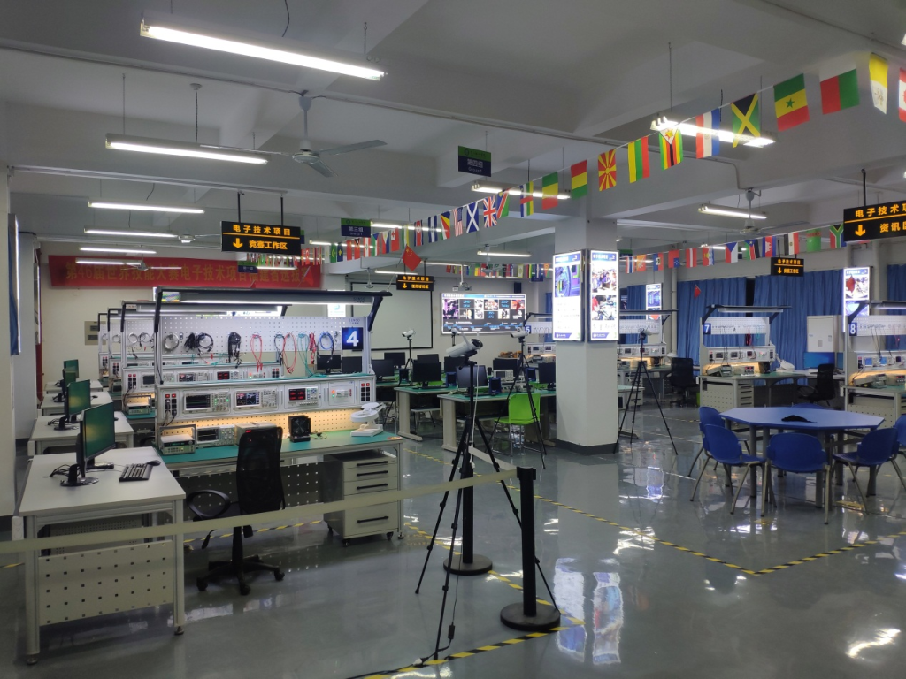 “世赛电子技术项目实训中心” 创建于2018年,占地300多平方米,按照国家集训基地要求建设,于2020年被福建省人社厅确定为世赛省级重点集训基地。中心划分为专家讨论办公室、物料存储间、资料查询区、任务讨论区、竞赛区、电路板雕刻区等7个区域,现有8套第45届世界技能大赛电子技术项目专用竞赛平台和2套电路板激光制造系统,配套完整的训练、比赛资料和方案。