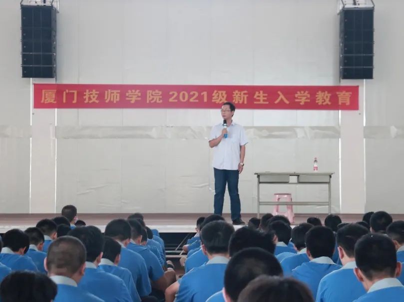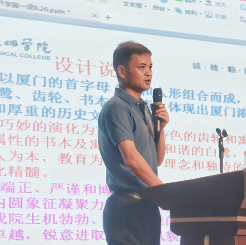 学生处处长普涛老师就学院的发展沿革着手,讲述了学院从“筚路蓝缕,以启山林”到“搬迁翔安,再创新高”的办学历程,并介绍了学院总体规划、校徽的寓意、学院的愿景、使命和价值观等。