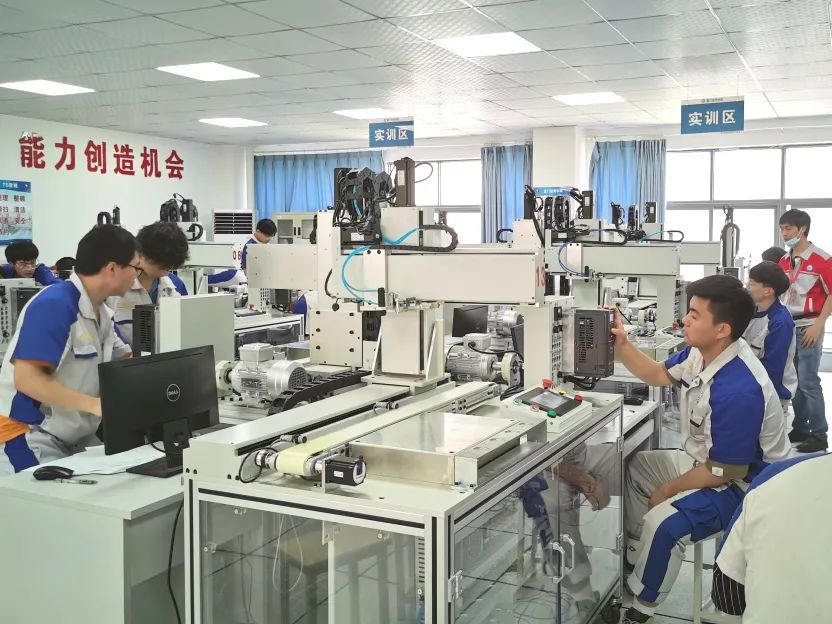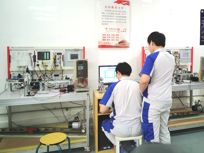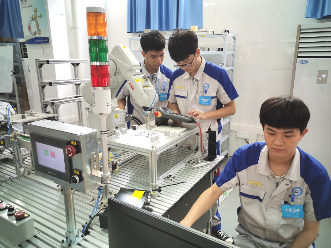 在机器人工作站故障排除比赛中,参赛选手聚精会神地对机器人工作站外围设备进行分析,认真思考系统故障,并进行逐一排除。