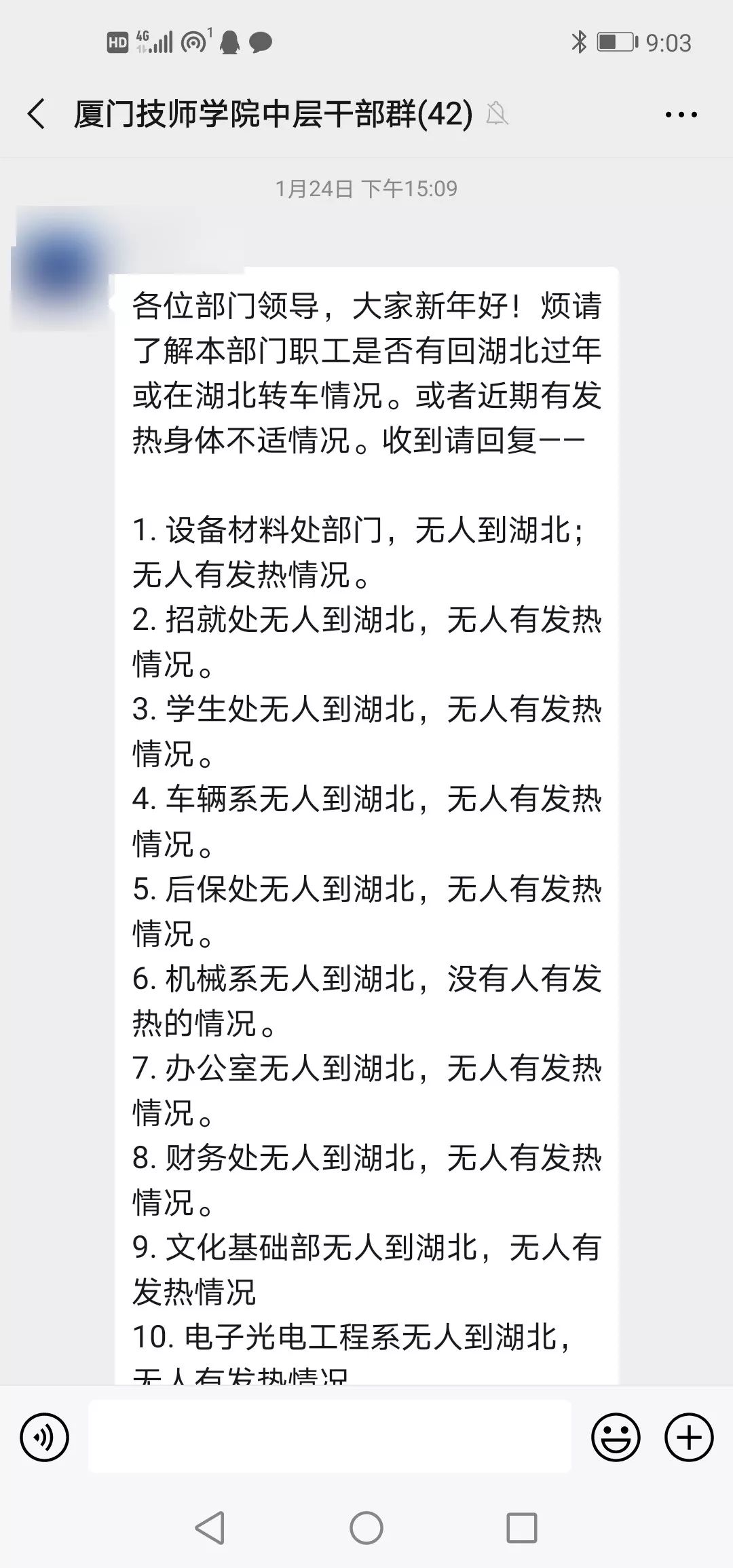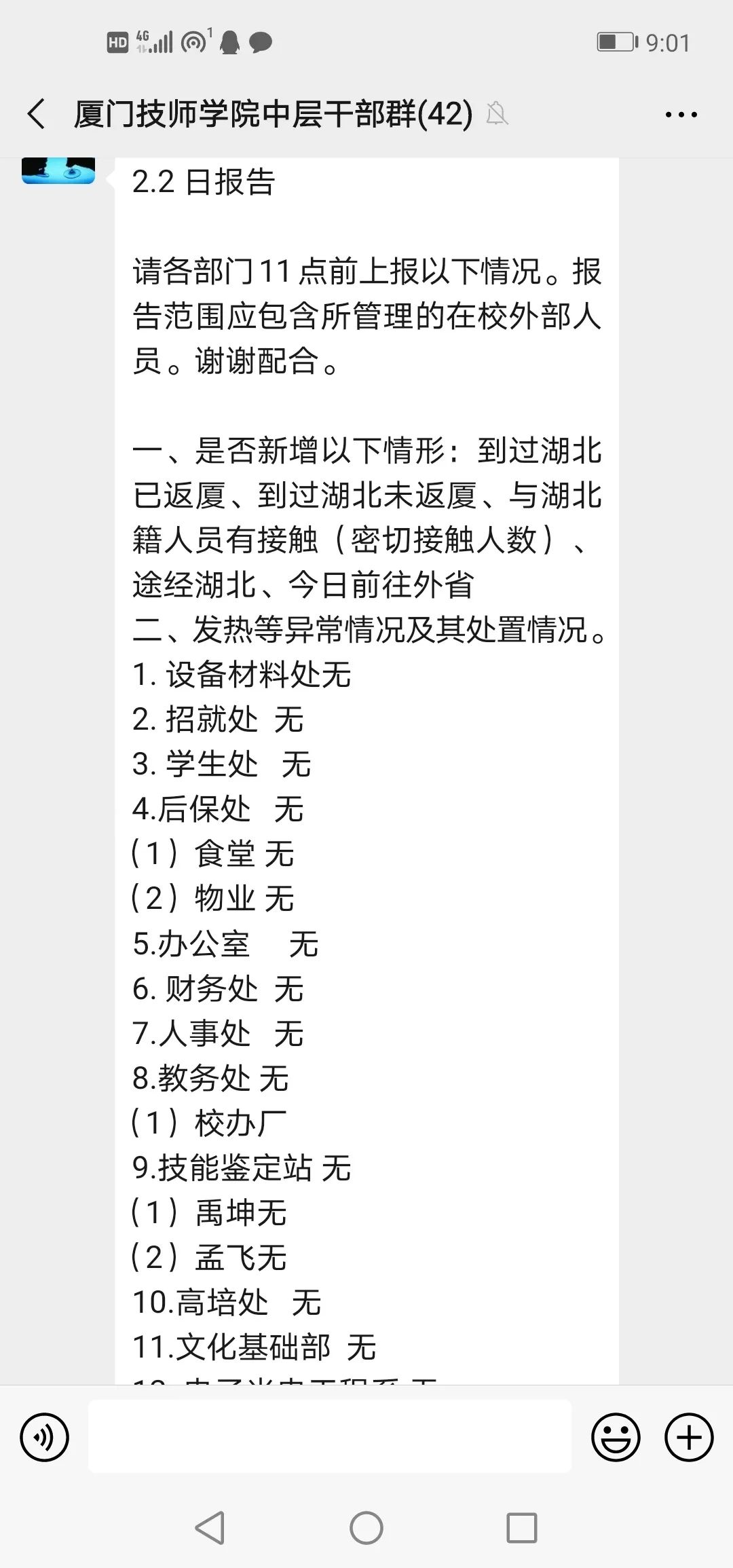 在学院防控小组指挥下,各部门加强联防联控,对全院师生的健康进行监控,合力做好校园疫情防控工作。1月24日,学院开始组织全院师生实行“日报告、零报告”防控疫情报告制度。信息员每日汇总师生信息,及时上报《厦门市教育系统师生疫区接触情况汇总表》、市直机关党工委《干部职工、家属、接触外来人口有关信息统计表》、《翔安区应对新型冠状病毒感染肺炎疫情(每日快报)》;每日实时向主管局报告学院情况。