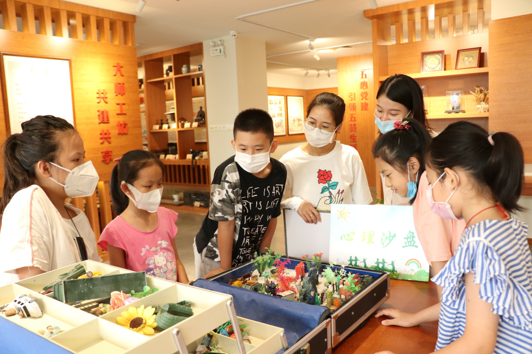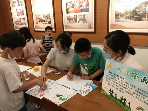 胡慧颖老师、黄小虾老师、冯红果老师、邱丽双老师为孩子们带来心理OH卡体验,潘梅桂老师、陈婷婷老师带领了团体心理沙盘的合作互动游戏,吴佳妮老师、洪俊琳老师则为大家组织了心理绘画的体验环节。